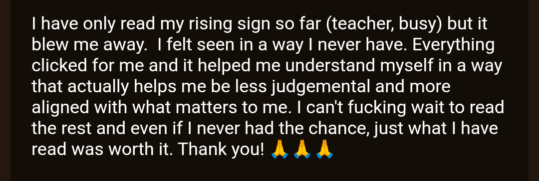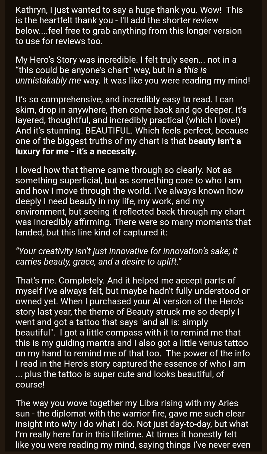 And even then as a professional astrologer I hated not being able to give my clients THIS level of comprehensive clarity in one unified document. I hated 'one night stand' astrology where people felt SEEN in our readings but forgot half of what we talked about the next day.